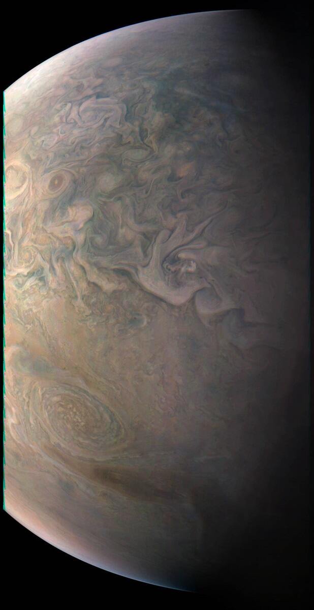 На снимке газового гиганта заметно атмосферное завихрение NN-LRS-1, которое ученые называют младшим братом Большого красного пятна, которое уже давно стало главным отличительным знаком Юпитера.